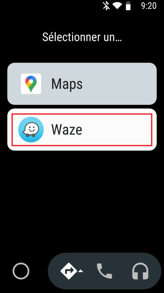 - Depuis l’écran, choisissez votre appli GPS. Place au mode routier : sélectionnez Waze, qui propose alors une interface épurée et lisible, pensée pour la conduite.